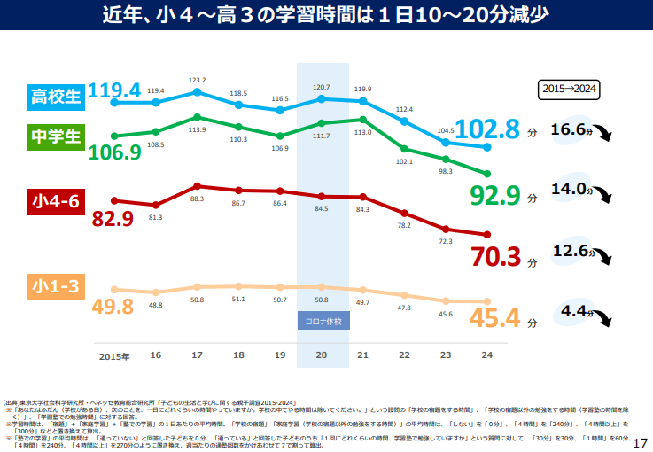 学校外の学習時間に、塾や家庭教師の授業が入っていて、それを除いた家庭学習時間は相当少ないはず。言語学習に不足してるのは、授業ではなく自習。自分で単語を覚える、音読、文章を読むなど。10年後の学校では、個別に課題を提示して、自習の進捗をフォローする仕組みが当たり前になってるはず。 x.com/knockout_/stat…